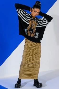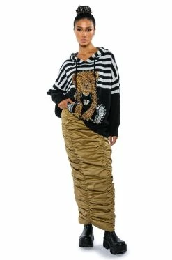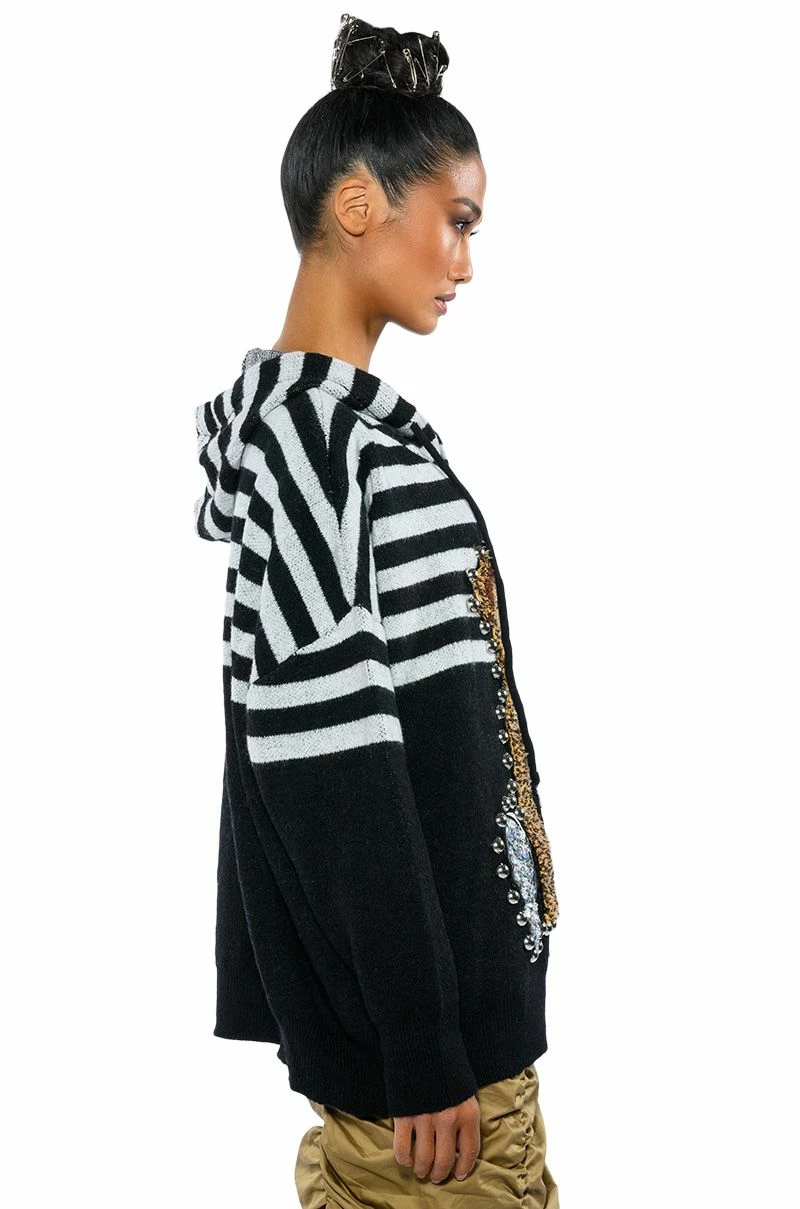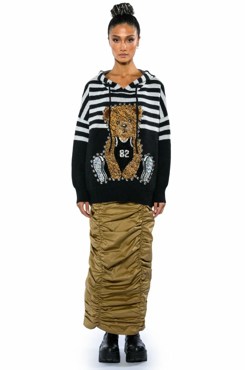 The AKIRA Label Teddy Hooded Striped Sweater features a cozy knit fabrication, an attached drawstring hood, sloped shoulders, long sleeves, ribbed knit hems, an oversized silhouette, and stripe print patterning. Complete with a fuzzy textured teddy bear front graphic, sequin detailing, and silver studded accents.