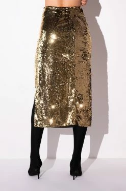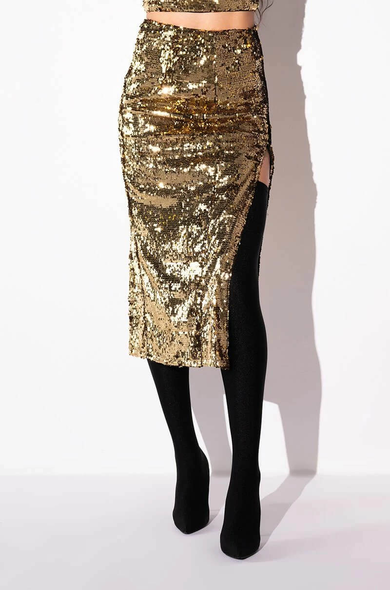 The AKIRA Label Thank The Academy High Slit Mesh Maxi Skirt features a sequin-embellished fabrication, a maxi length silhouette, a sexy high side slit, a smooth inner lining, and a concealed back zipper closure. Pair this glimmering piece with the coordinating AKIRA Label Thank The Academy Sleeveless Cowl Neck Crop Top for a complete look.