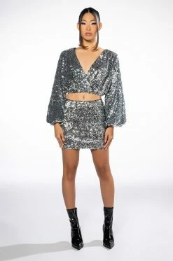 The AKIRA Label Viva Las Vegas Mini Skirt is a luxe piece featuring a mini length silhouette, sequin-embellished accents, a mesh base, a soft, smoother inner lining, and a concealed back zipper closure. Pair this piece with the coordinating AKIRA Label Viva Las Vegas Long Sleeve Cropped Wrap Blouse to complete your look!