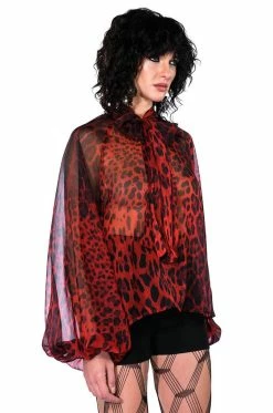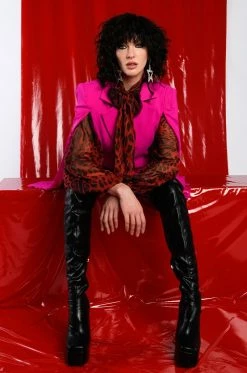 Boss babe coming through. Strut your stuff in The AKIRA Label Walk The Walk Tie Neck Sheer Blouse. This sheer chiffon blouse features a high tie front neckline, a keyhole accent, and long blouson sleeve. Complete with a flowy, flirty silhouette, and animal print patterning. Style this versatile blouse with a sleek bodysuit and trousers or atop a bodycon midi dress.