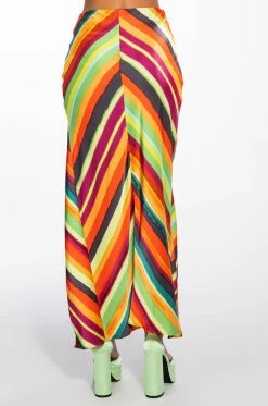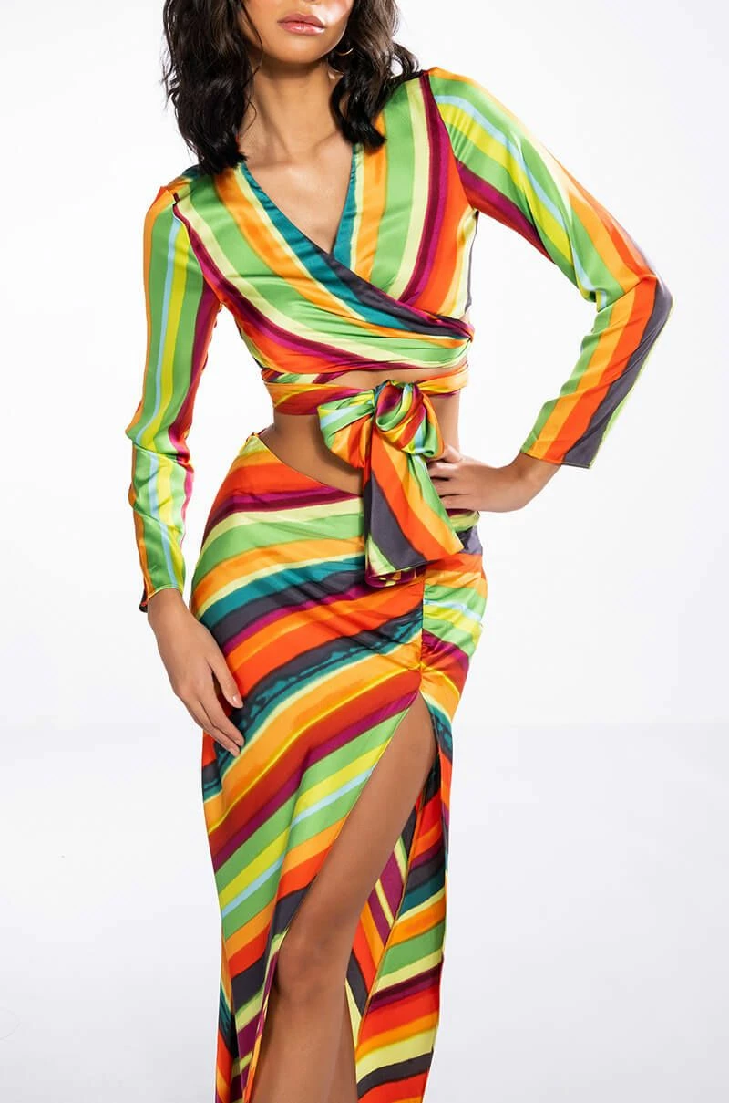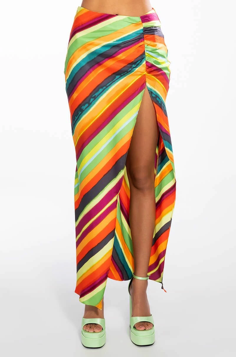 The AKIRA Label Want You To Want Me Midi Skirt With High Slit is made from a satin fabrication and features a multicolor striped pattern, a high rise waist with a thin elastic waistband, side ruched detailing with a sexy high slit, midi length, and a tonal side zipper closure. Pair this bold piece with the matching AKIRA Label Want You To Want Me Tie Front Blouse and platform sandals to finish off your vibrant look.