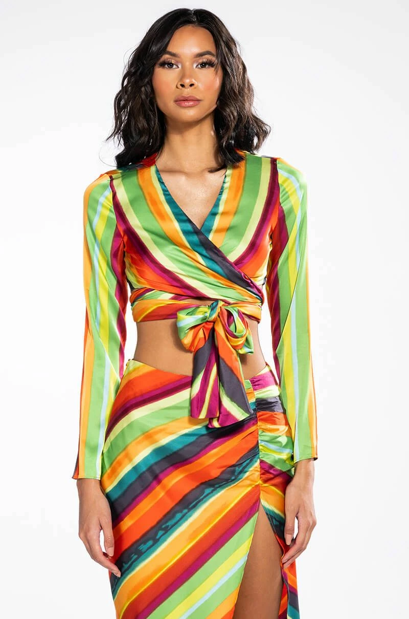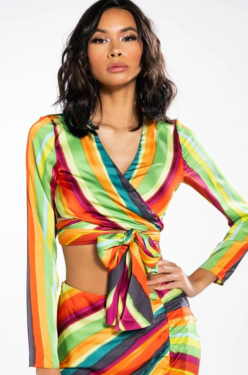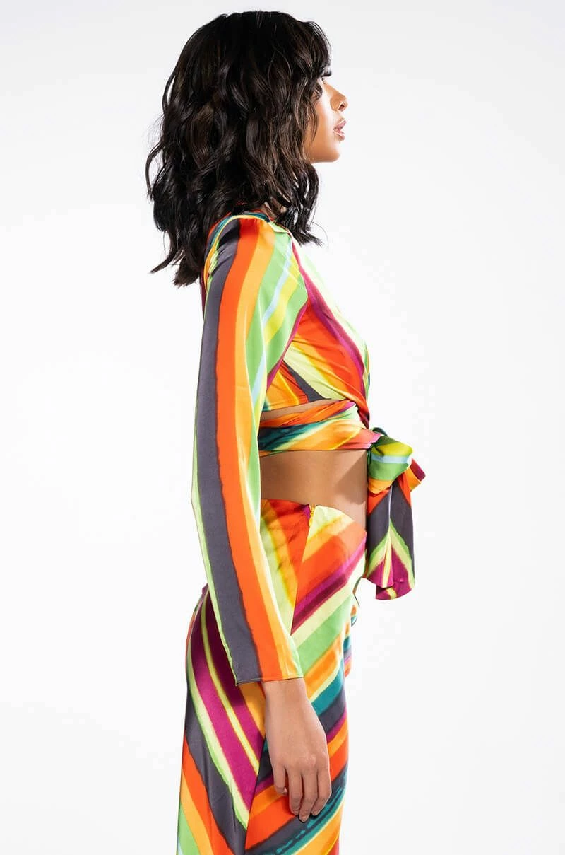 The AKIRA Label Want You To Want Me Tie Front Blouse is made from a satin fabrication and features a multicolor striped pattern, a plunging neckline, long sleeves, a cropped silhouette, and a tie front closure. Pair this bold piece with the matching AKIRA Label Want You To Want Me Midi Skirt With High Slit and platform sandals to finish off your vibrant look.