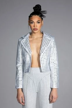 The AKIRA Label Year Of The Tiger Silver Metallic Rhinestone Moto Jacket is an ultra-glam piece featuring a faux leather base, a fold over notch lapel collar, glimmering rhinestone stud detailing throughout, an elaborate rhinestone-embellished flaming tiger back patch accent, and sequin embroidered “04,” lettering. Complete with long sleeves, a slightly cropped cut, a satin inner lining, and an open front design.