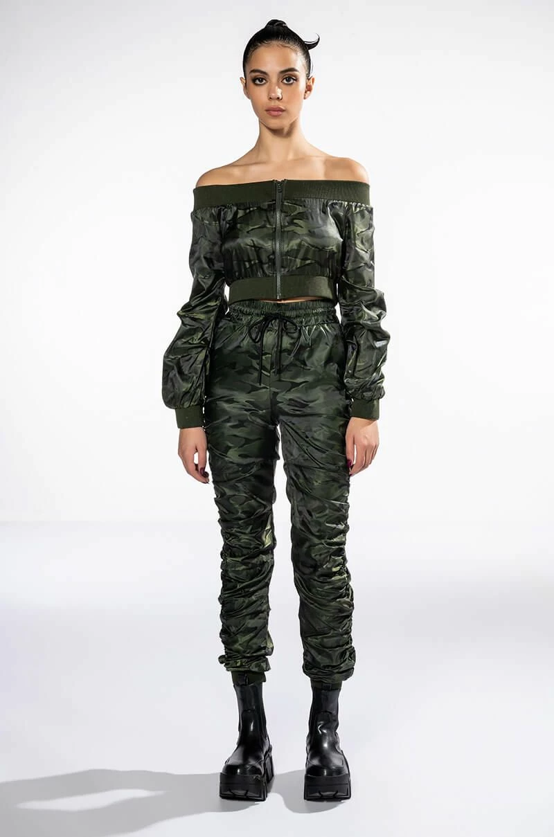The AKIRA Label You’re The Problem Ruched Jogger is a slick nylon pant featuring an elasticated waistband, a drawstring waist tie, on-seam side pockets, and ruched detailing throughout. Complete with ribbed knit ankle cuff detailing and camo print patterning. Style with the coordinating AKIRA Label You’re The Problem Zip Up Top for a casual chic look.