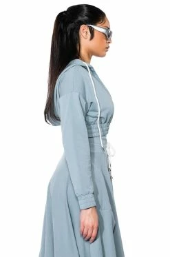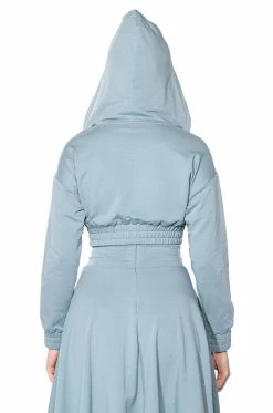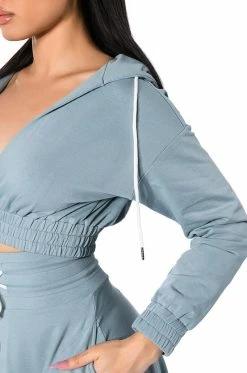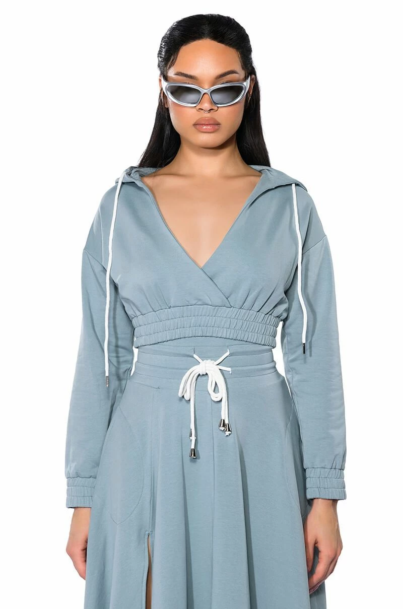 The AKIRA Label Zumi Cropped Wrap Front Hoodie is made with a cotton blend base fabric, and features a deep V neckline, an attached drawstring hood, and a wrap front design. Complete with long sleeves, ruched elastic hems, and a cropped silhouette. This unique take on the traditional hoodie pairs perfectly with the coordinating AKIRA Label Zumi Maxi Skirt and platform boots.